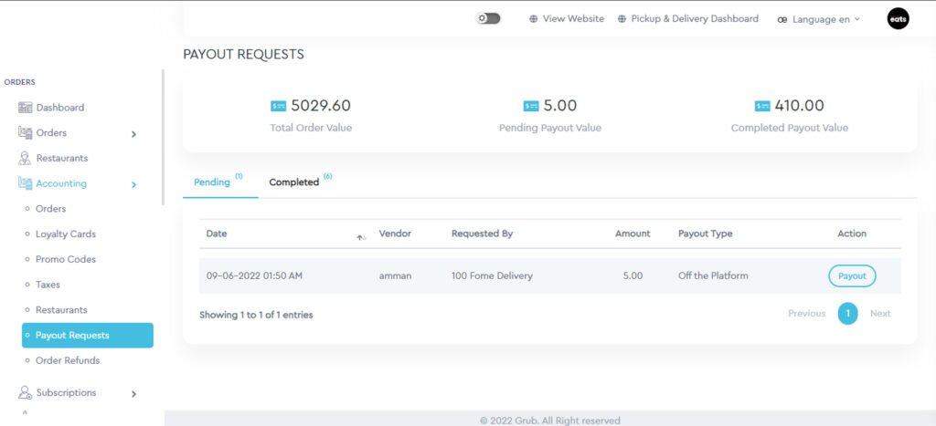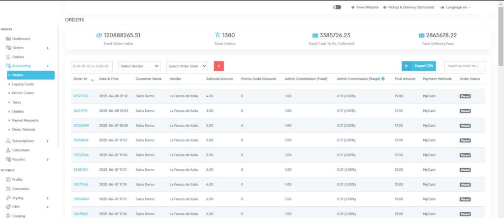 Admin can search for a particular order from the list or apply filters like date, vendors, and order status to fetch the order data. These orders list can also be exported to CSV file format.