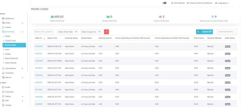 Next, the admin can explore the list of orders where the promo codes were applied and can be searched for a specific order, filtered for a particular date, by order status, and by a specific promo code. The entire list can also be exported in CSV file format.