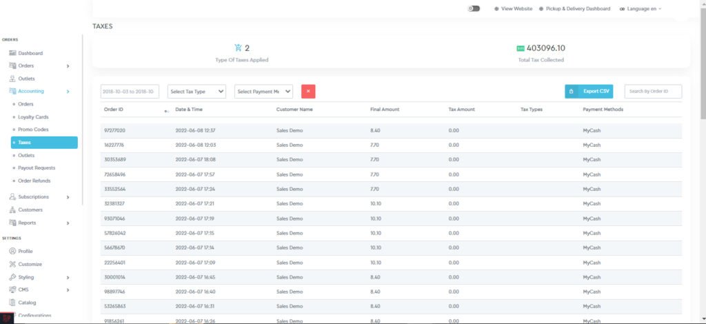 The list of the orders can be seen with the applied taxes. This list can again be filtered using the date and time, tax type, and payment mode.