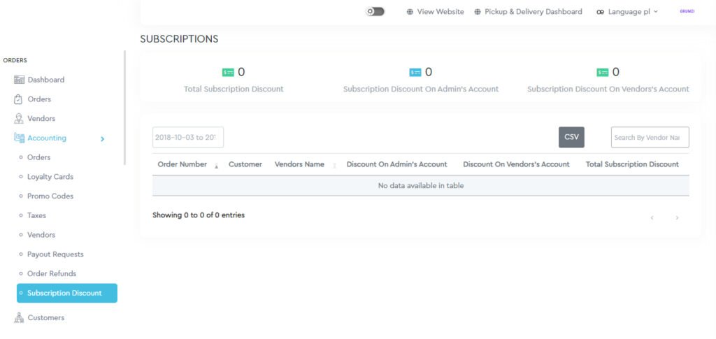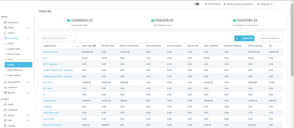 The admin can filter out the orders by date and vendor’s name and export the CSV file.