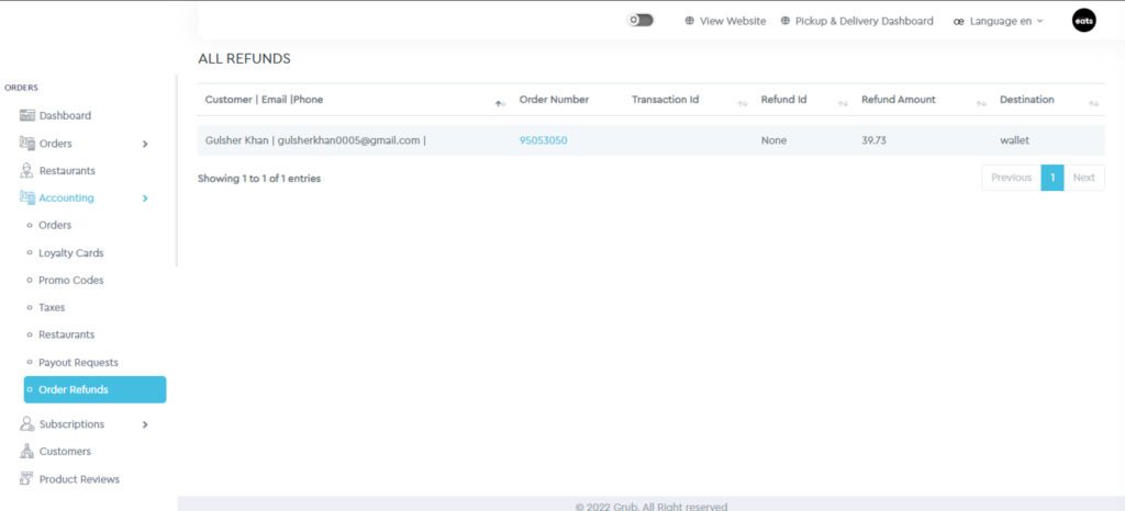 The history of orders which have been refunded can be seen in this section. The order’s number, transaction ID, refund ID, refunded amount and the destination, where the refund is deposited, is all available in the order refunds section.