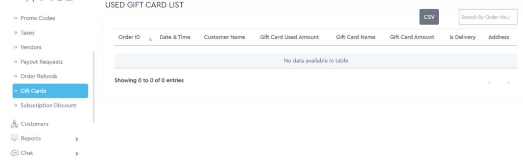 The admin can get a list of orders where gift cards have been used. They can export it in a CSV format.