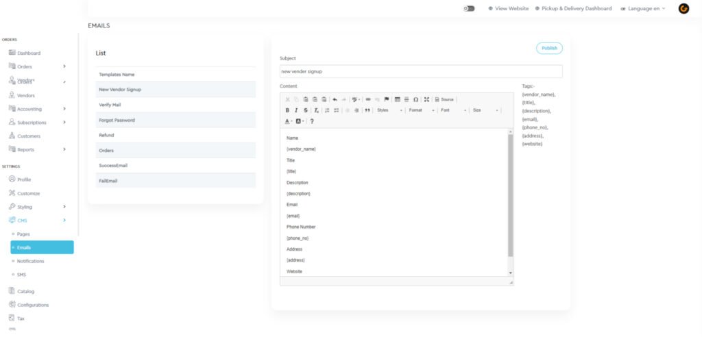 The platform’s admin can manage email templates. These templates include the vendor sign-up email template, verify email template, forgot password email template, order email template, and refund order email template.