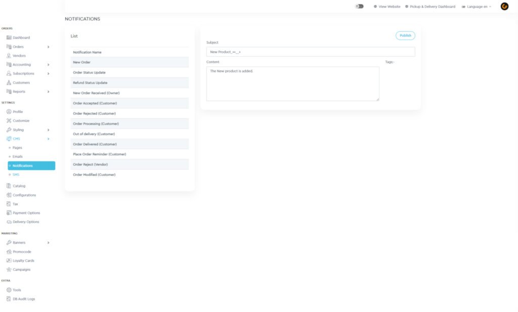 The admin can manage the SMS content for short messages sent to customers’ mobile numbers. These SMS templates include orders placed successfully, OTP SMS for user and vendor login, user sign-up, etc.